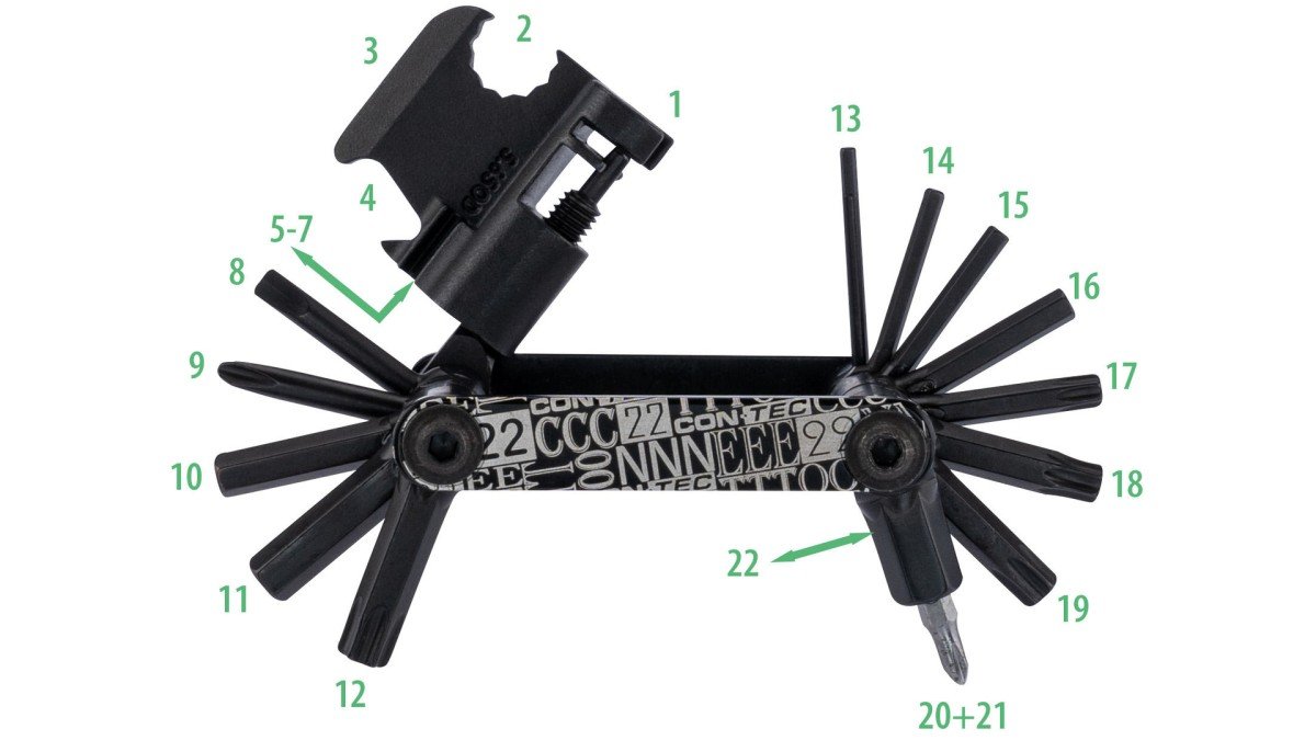 CONTEC multifunctie-tool "Pocket Gadget - F22 Stealth" Presentatieverpakking, 157,5 g 22 functies: 1 = Kettingpons 2 = 10 mm steeksleutel 3 = Remzuiger terugzetter 4 = Flesopener 5 = 3,2 mm spaaksleutel 6 = 3,5 mm spaaksleutel 7 = 5,65 mm spaaksleutel 8 = 4 mm gleufschroevendraaier 9 = 2 mm kruiskopschroevendraaier 10 = 5 mm binnenzeskant-sleutel 11 = 6 mm binnenzeskant-sleutel 12 = T40 zespunt ster-profiel 13 = 2 mm binnenzeskant-sleutel 14 = 2,5 mm binnenzeskant-sleutel 15 = 3 mm binnenzeskant-sleutel 16 = 4 mm binnenzeskant-sleutel 17 = T25 zespunt ster-profiel 18 = T27 zespunt ster-profiel i.› zwart